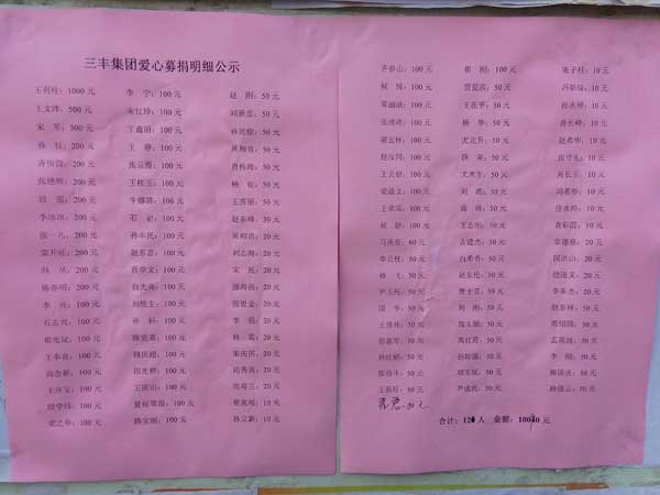 消息传来,公司全体职工为之震惊,为这么幼小的生命患此重病深感着急和痛心。公司董事长王总对此非常重视,“一方有难,八方支援”,丁修格是我们三丰集团的一员,如今他有难,我公司有责任向他伸出援助之手,帮助他排忧解难,战胜病魔,尽我们最大的努力。随后安排相关部门组织全体职工进行募捐,并在公司二楼会议室举行了献爱心捐款仪式。从2月18日-22日,集团公司共计募集善款10090元,随后针对募捐善款在公司进行了张榜公示,公司总经理王文泽将善款亲自交到了丁修格手中。